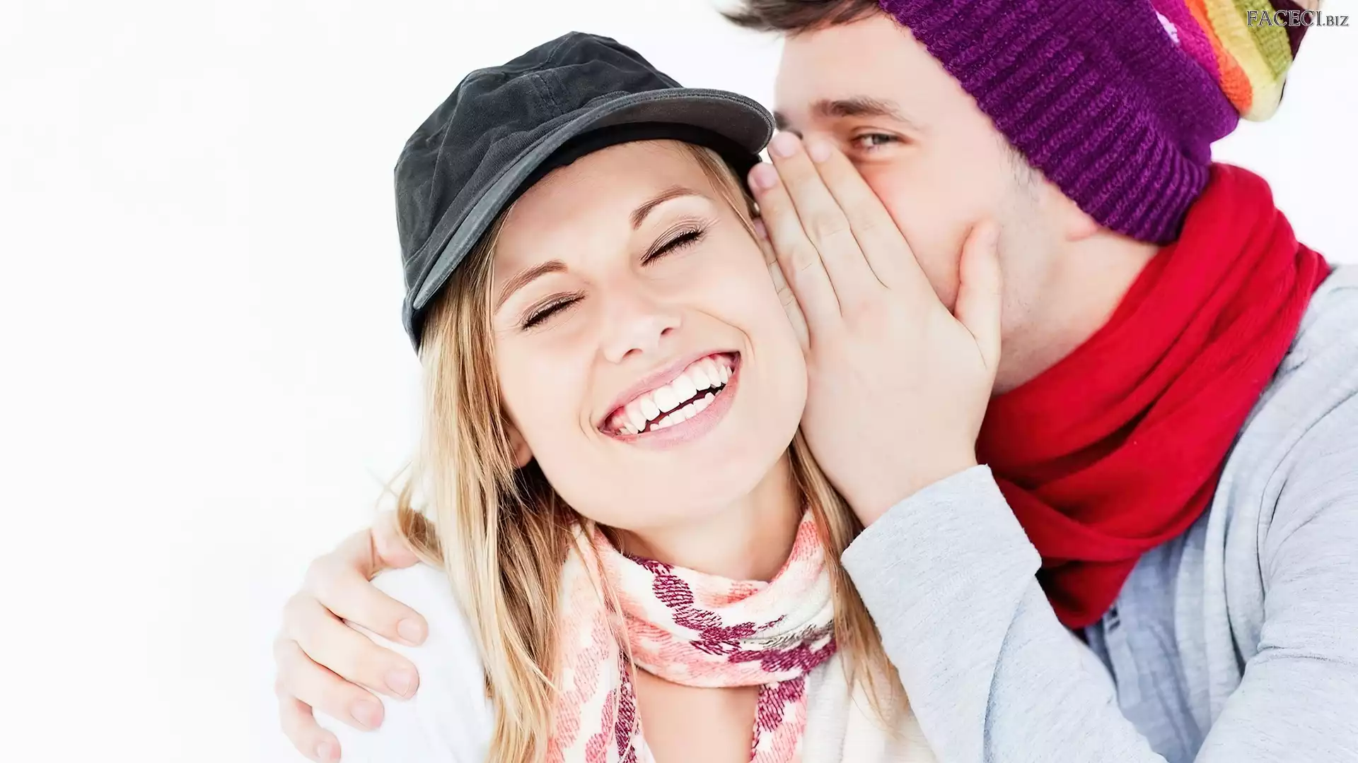 Uśmiech, Para, Czapki, Spojrzenie, Przyjaźń, Sekret - faceci.biz